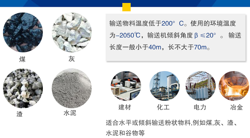 粉末螺旋輸送機(jī)廣泛應(yīng)用于建材,化工,電力,冶金,木炭,糧食等行業(yè)。適合水平或傾斜輸送粉狀物料,例如煤,灰、渣、水泥和谷物等,輸送物料溫度低于200°C。使用的環(huán)境溫度為-2050℃,輸送機(jī)傾斜角度β≤20°。 輸送長度一般小于40m,長不大于70m。