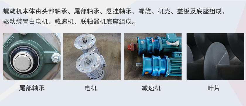 螺旋機(jī)本體由頭部軸承、尾部軸承、懸掛軸承、螺旋、機(jī)殼、蓋板及底座組成,驅(qū)動裝置由電機(jī)、減速機(jī)、聯(lián)軸器機(jī)底座組成。