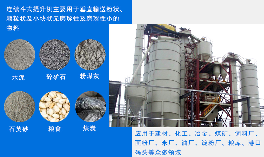 連續(xù)斗式提升機(jī)主要用于垂直輸送粉狀、顆粒狀及小塊狀無(wú)磨琢性及磨琢性小的物料,如:水泥、糧食、煤炭、粉煤灰、碎礦石、石英砂、石塊、粘土、化肥等,應(yīng)用于建材、化工、冶金、煤礦、飼料廠、面粉廠、米廠、油廠、淀粉廠、糧庫(kù)、港口碼頭等眾多領(lǐng)域。