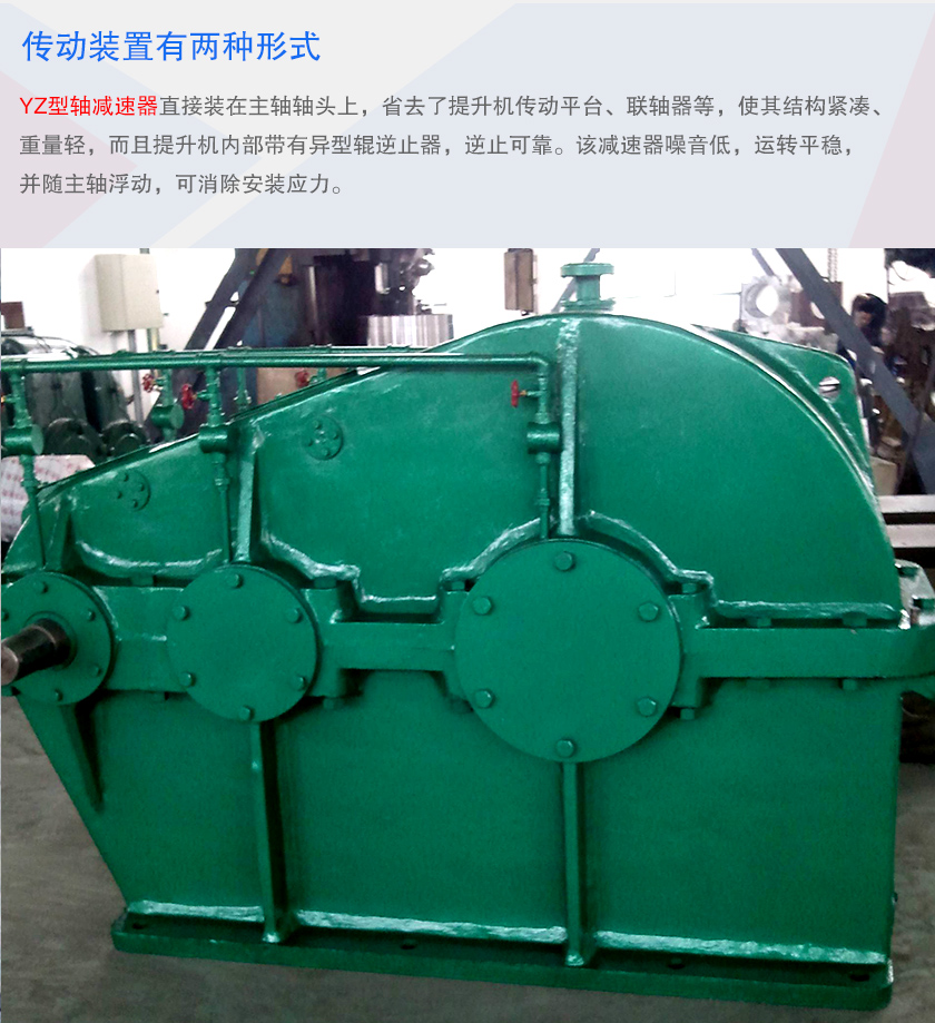 傳動(dòng)裝置有兩種形式,分別配有YZ型減速器、ZQ(或YY)型減速器。YZ型軸減速器直接裝在主軸軸頭上,省去了提升機(jī)傳動(dòng)平臺(tái)、聯(lián)軸器等,使其結(jié)構(gòu)緊湊、重量輕,而且提升機(jī)內(nèi)部帶有異型輥逆止器,逆止可靠。該減速器噪音低,運(yùn)轉(zhuǎn)平穩(wěn),并隨主軸浮動(dòng),可消除安裝應(yīng)力。ZQ型減速器工作環(huán)境溫度為-40℃到+40℃,轉(zhuǎn)速不大于1500轉(zhuǎn)/分,齒輪傳動(dòng)圓周速度不大于10米/秒,此種類型的減速器強(qiáng)度高,齒面磨損小,使用壽命長(zhǎng)。