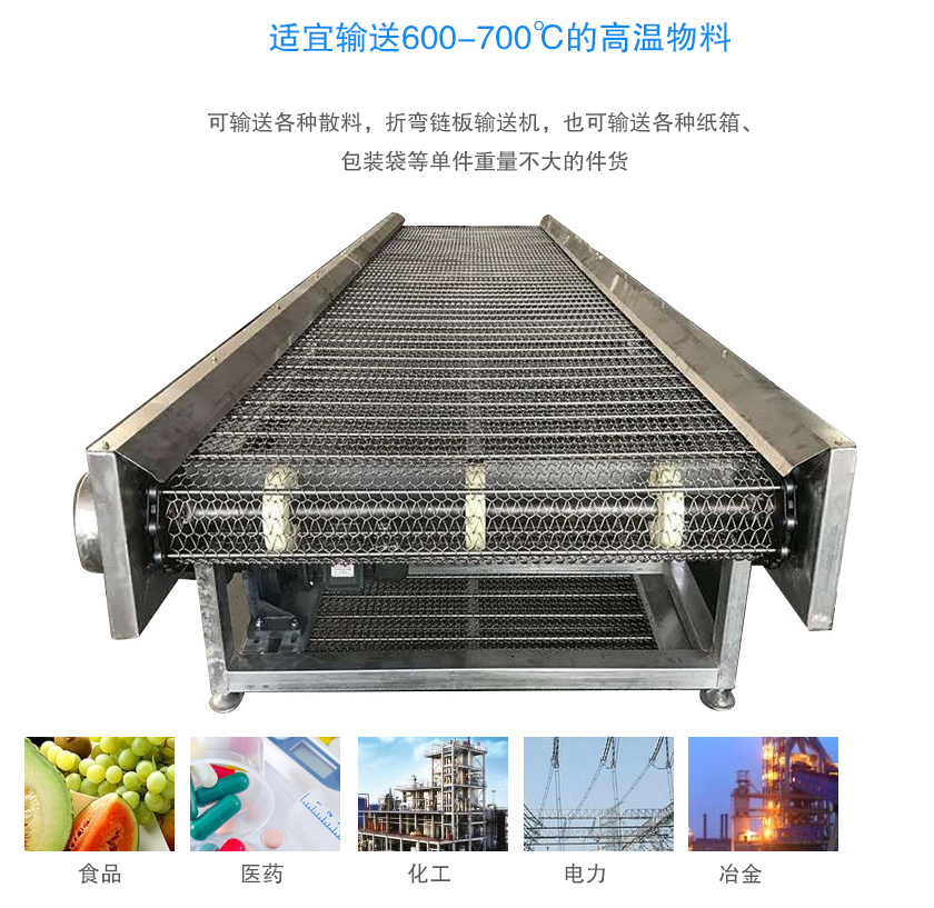 鏈板輸送機采用鏈板輸送帶180°鏈板輸送機用于銜接,與其他輸送設備配合使用能充分節(jié)省空間并能起到良好的輸送效果。轉彎角度可分:60°、90°、180°。可輸送的物料種類繁多,既可輸送各種散料,折彎鏈板輸送機,也可輸送各種紙箱、包裝袋等單件重量不大的件貨,廣泛應用于食品、醫(yī)藥、化工、電力、冶金等行業(yè),適宜輸送600-700℃的高溫物料。