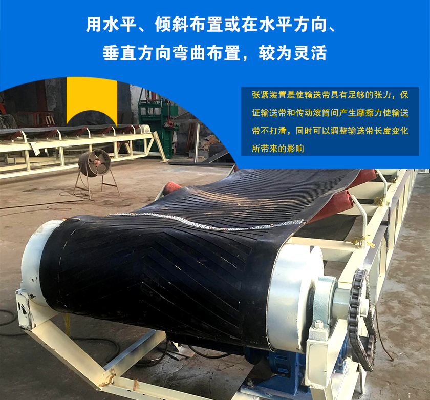 3、張緊裝置是使輸送帶具有足夠的張力,保證輸送帶和傳動(dòng)滾筒間產(chǎn)生摩擦力使輸送帶不打滑,同時(shí)可以調(diào)整輸送帶長度變化所帶來的影響