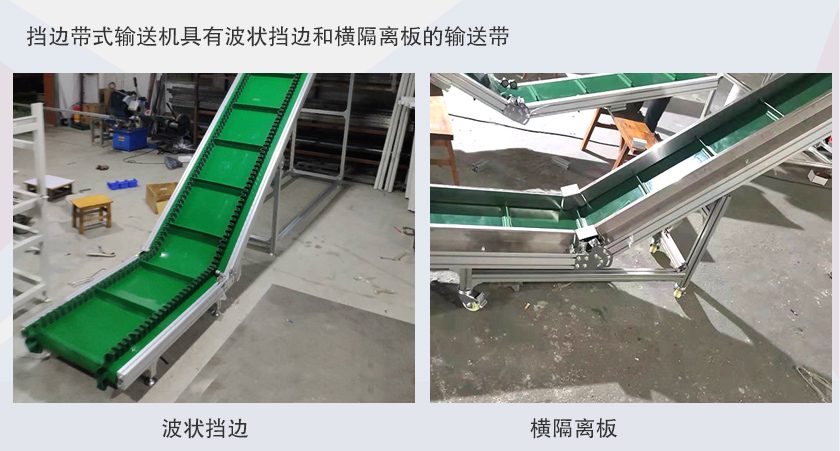 擋邊帶式輸送機(jī)具有波狀擋邊和橫隔離板的輸送帶,適用于大傾角連續(xù)輸送散裝物料,擋邊帶式輸送機(jī)的輸送帶兩則有波狀紋的擋邊,皮帶中間部位有橫隔板,在輸送物料的過(guò)程中不容易撒料和下滑,適用于大傾角連續(xù)輸送散狀物料。