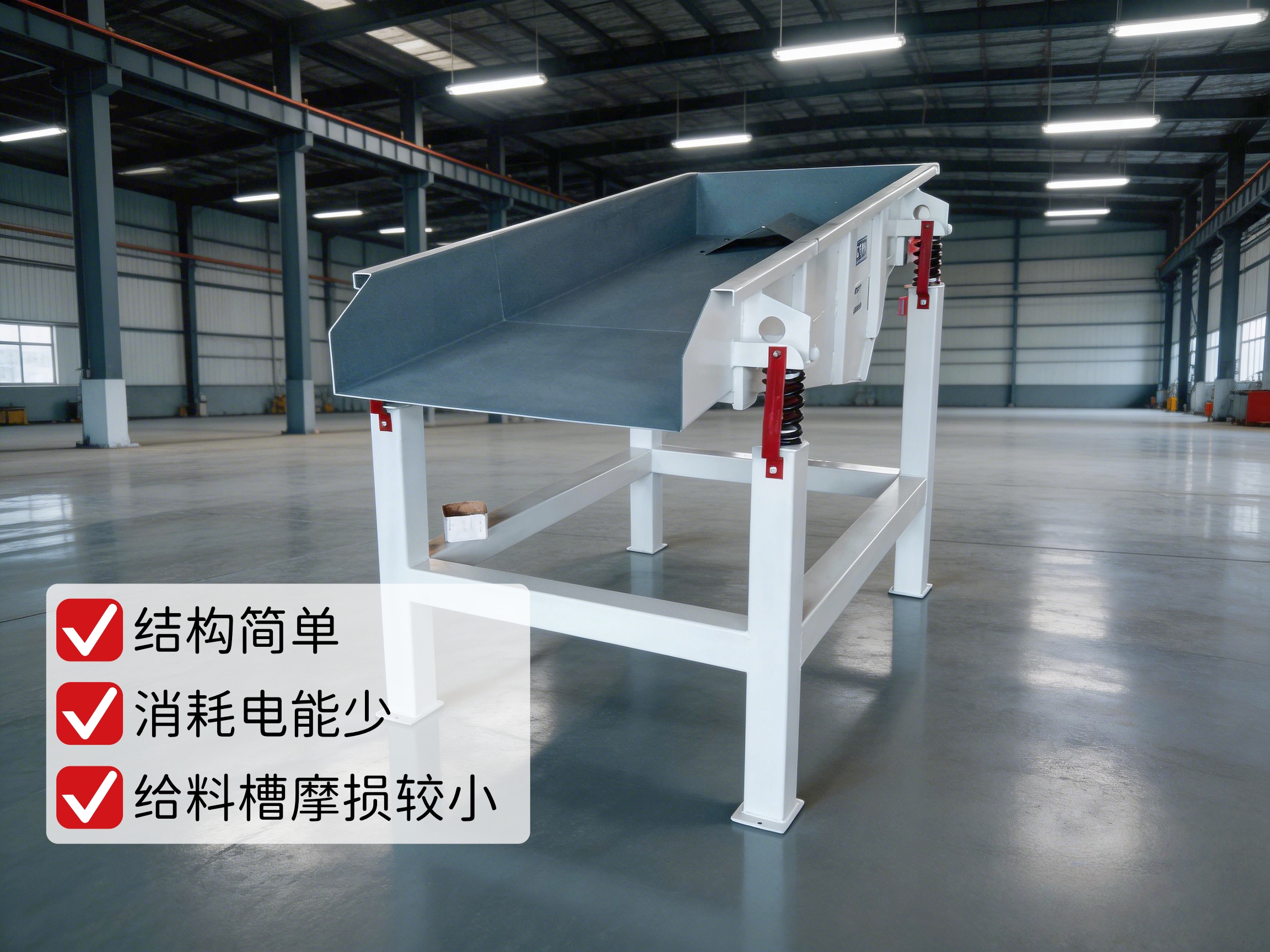 因為給料槽中的物料在給料過程中連續(xù)地被拋起,并按拋物線的軌跡向前進行踴躍運動,所以給料槽的磨損較小。