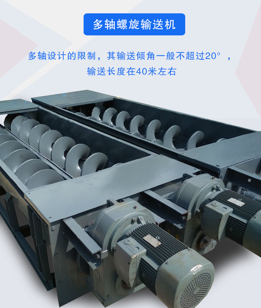 多軸螺旋輸送機(jī)采用2根以上螺旋軸,與單軸螺旋輸送機(jī)相比具備攪拌作用,輸送傾角一般不超過20°,輸送距離在40米左右.多軸螺旋輸送機(jī)采用封閉式輸送,無粉塵污染.