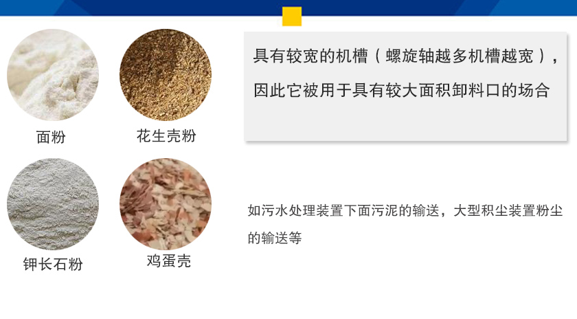 多軸螺旋輸送機(jī)具有較寬的機(jī)槽(螺旋軸越多機(jī)槽越寬),因此它被用于具有較大面積卸料口的場合,如污水處理裝置下面污泥的輸送,大型積塵裝置粉塵的輸送等,如:面粉、花生殼粉,玉米粉,鉀長石粉,雞蛋殼等等。