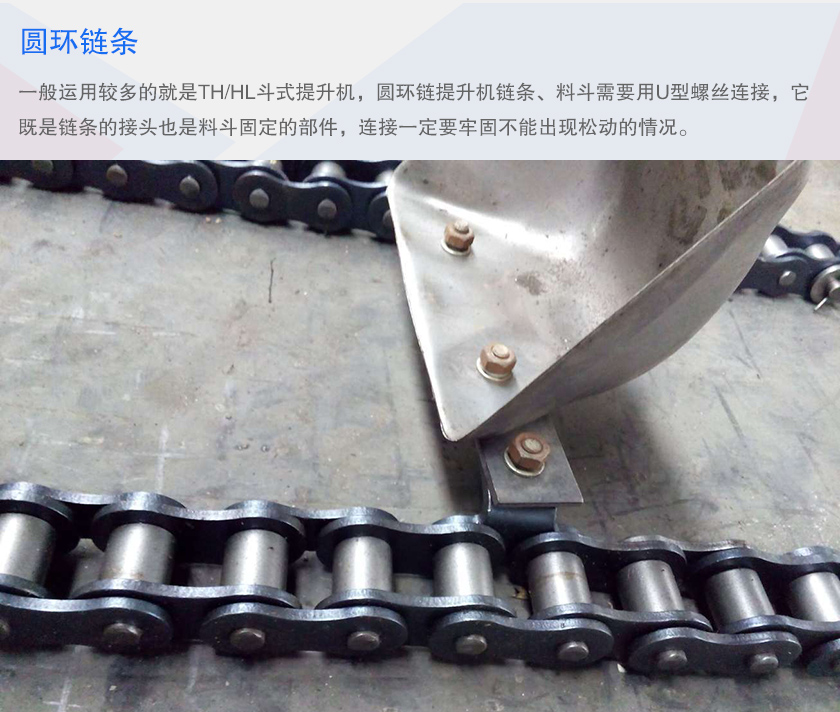 斗式提升機圓環(huán)鏈條一般運用較多的就是TH斗式提升機,圓環(huán)鏈提升機鏈條、料斗需要用U型螺絲連接,它既是鏈條的接頭也是料斗固定的部件,連接一定要牢固不能出現(xiàn)松動的情況。