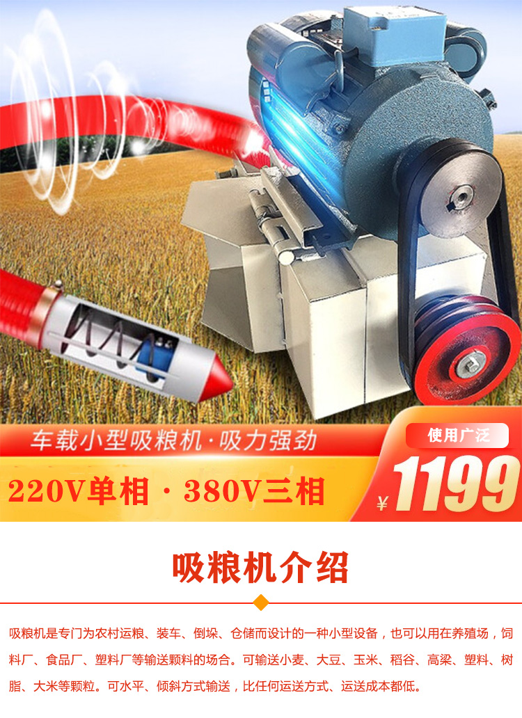 吸糧機(jī)是一種通過管道輸送散裝谷物的設(shè)備。它的主要功能是將谷物從一個(gè)設(shè)備運(yùn)輸?shù)搅硪粋€(gè)設(shè)備,常見的一種是將地面上的散糧運(yùn)輸?shù)娇ㄜ嚿?,將卡車上的散糧運(yùn)輸?shù)郊Z庫,將顆粒狀物料運(yùn)輸?shù)綊伖鈾C(jī)等設(shè)備上。本文將詳細(xì)為您講解吸糧機(jī)的工作原理及用途。