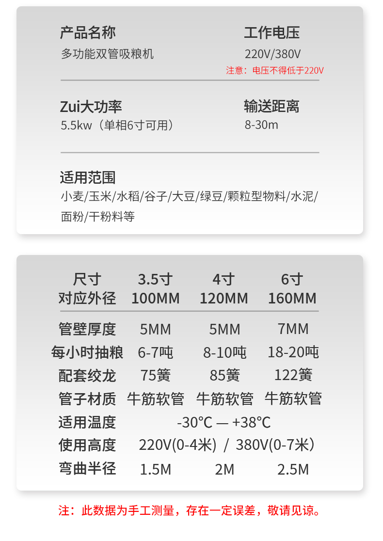 機器7m以下可使用3kw兩相/3KW三相銅線電機,8m-12m之間可使用4kw三相電銅線電機,一般情況下,220V垂直高度3米,380V垂直高度4米(數(shù)據(jù)一般以糧食為準)