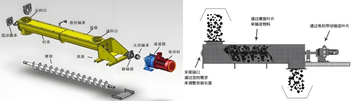 螺旋輸送機(jī)工作原理 是在設(shè)備啟動后,電機(jī)通過減速機(jī)帶動螺旋軸以一定轉(zhuǎn)速旋轉(zhuǎn)。焊接在軸上的螺旋葉片隨之轉(zhuǎn)動,進(jìn)入輸送槽內(nèi)的物料在葉片的推動下產(chǎn)生軸向移動。由于物料與槽體之間存在摩擦阻力,物料不會隨葉片一起旋轉(zhuǎn),而是被連續(xù)推送向前,從進(jìn)料口輸送至出料口,實(shí)現(xiàn)連續(xù)輸送。