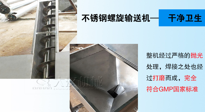 我們公司生產(chǎn)的不銹鋼螺旋輸送機(jī)采用精選304、316、316L等不同等級(jí)的不銹鋼材質(zhì),并且整機(jī)經(jīng)過嚴(yán)格的拋光處理,焊接之處也經(jīng)過打磨而成,符合食品行業(yè)衛(wèi)生要求。