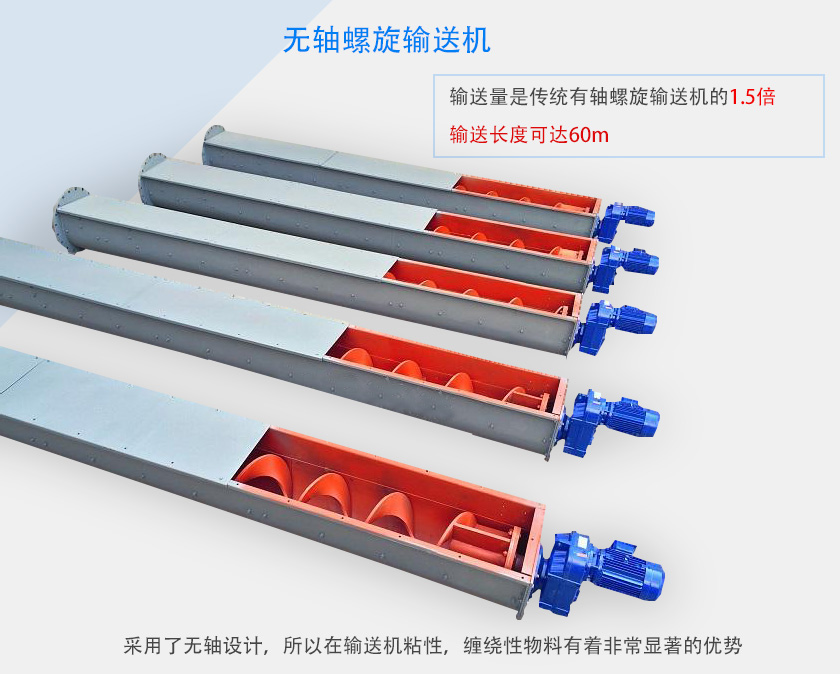 總結(jié):無軸螺旋輸送機(jī)由于采用無軸設(shè)計(jì),所以具備抗纏繞性,在輸送帶狀,粘性物料具備優(yōu)勢。其扭矩可達(dá)4000N/m,輸送量是傳統(tǒng)有軸螺旋輸送機(jī)的1.5倍,輸送長度可達(dá)60m,輸送效果尤為顯著。