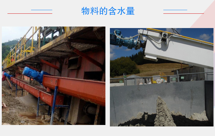 物料含水量的高低會影響螺旋輸送機(jī)輸送效率,含水量高,物料在輸送過程中極易粘附在螺旋葉片上火輸送機(jī)內(nèi)壁上,長此以往,粘附在葉片和內(nèi)壁上的物料會增多,造成堵網(wǎng)現(xiàn)象,大大降低螺旋輸送機(jī)的輸送量,長久黏附的物料還需要進(jìn)行人工清除。