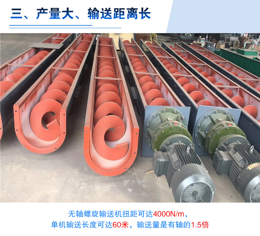 對于污泥輸送來說,用戶也比較關系設備的輸送效率,無軸螺旋輸送機扭距可達4000N/m,單機輸送長度可達60米,輸送量是有軸的1.5倍,另外還可根據(jù)用戶需要,采用多級串聯(lián)式安裝,對污泥進行超長距離的輸送。