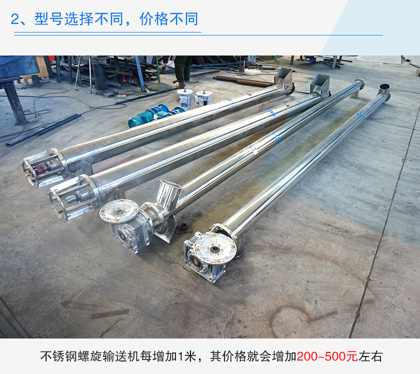 不銹鋼螺旋輸送機直徑從100~1250mm之間,選擇不同直徑的設(shè)備對于輸送量是有影響的,輸送量越大,選擇的管徑就越大,其價格就會越高,而且選擇的設(shè)備長度不同,其價格越會有所變化,不銹鋼螺旋輸送機每增加1米,其價格就會增加200~500元左右。