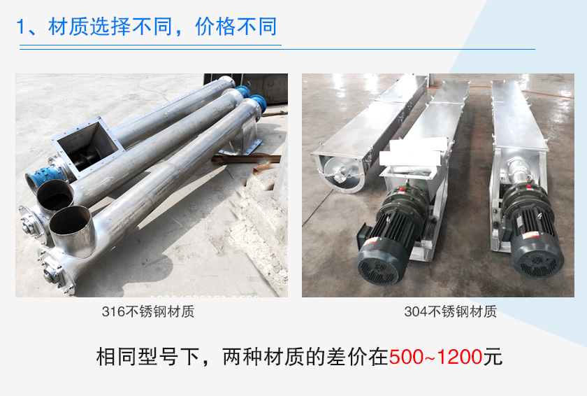 不銹鋼螺旋輸送機選擇的不銹鋼材質(zhì)一般包含304、316兩種,選擇不同材質(zhì),其價格會存在差異化,316不銹鋼材質(zhì)會比304不銹鋼材質(zhì)耐腐蝕,能抵抗更高的溫度,當然在制造成本上也會更高,相同型號下,兩種材質(zhì)的差價在500~1200元。