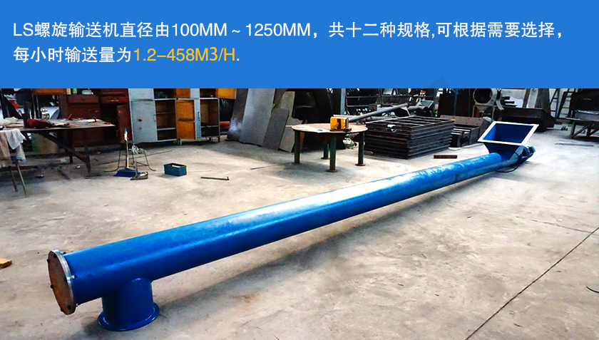 LS螺旋輸送機直徑由100mm~1250mm,共十二種規(guī)格,分為單驅(qū)動和雙驅(qū)動兩種形式,單驅(qū)動螺旋機長度可達(dá)40m(特大型30m),雙驅(qū)動螺旋機采用中間斷開軸結(jié)構(gòu),長度可達(dá)80m(特大型60m),螺旋機長度每 0.5m 一檔,可根據(jù)需要選擇,每小時輸送量為1.2-458m³/h.