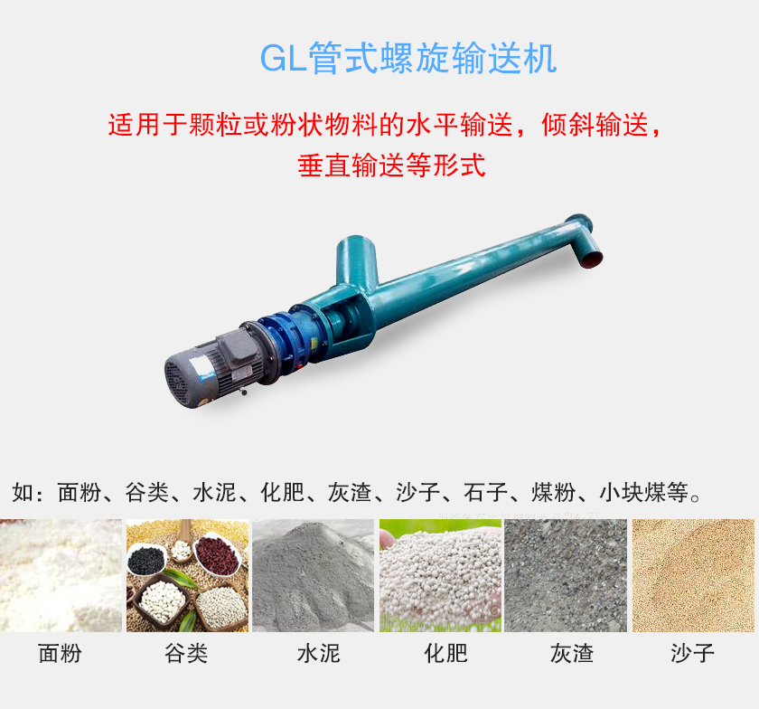GL管式螺旋輸送機適用于顆?;蚍蹱钗锪系乃捷斔?,傾斜輸送,垂直輸送等形式,如:面粉、谷類、水泥、化肥、灰渣、沙子、石子、煤粉、小塊煤等。